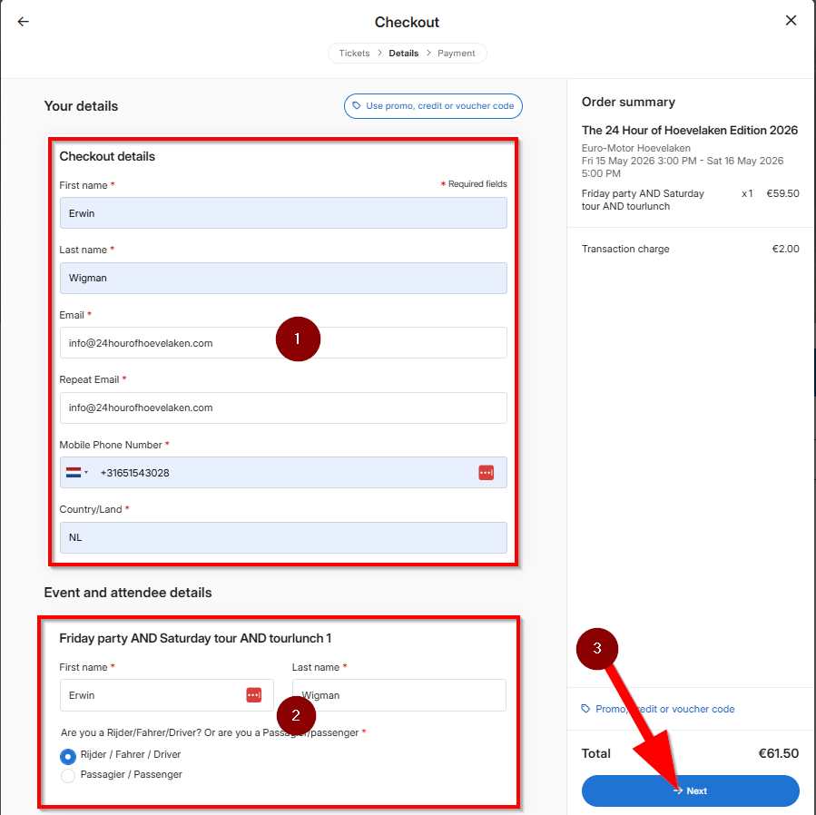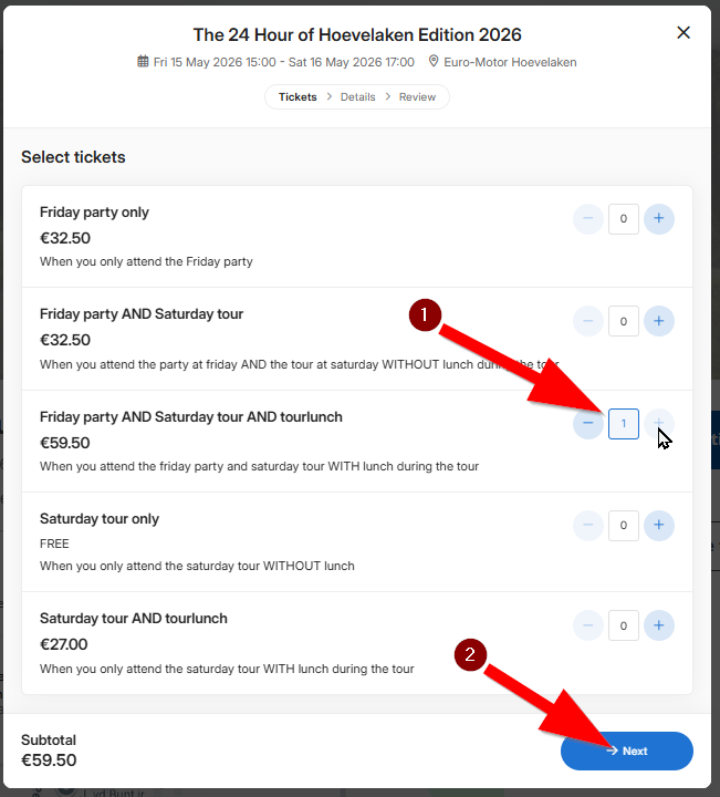 Bestel de tickets (1) en klik op “Next” (2)