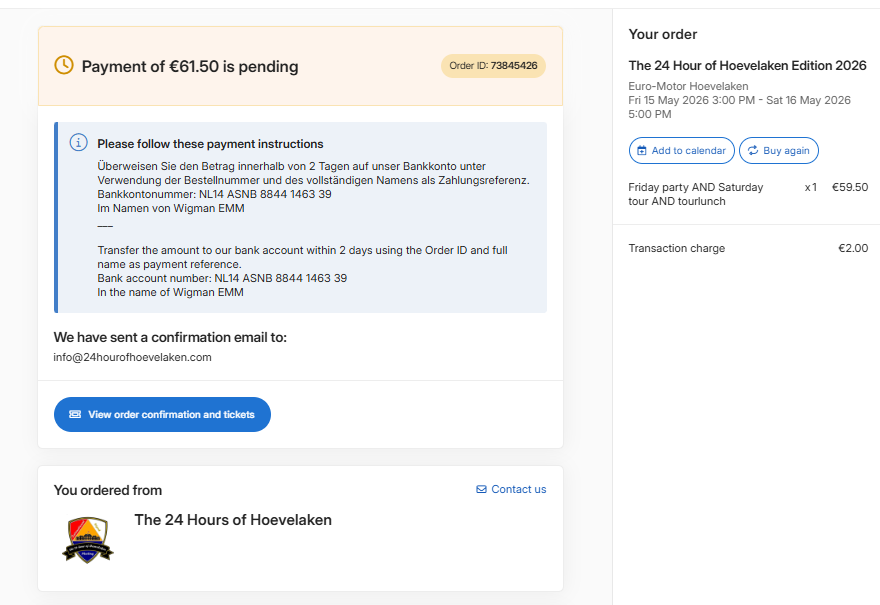 Na afronden van de bestelling/betaling krijg je ook een orderbevestiging via email inclusief het ticket als pdf-bestand